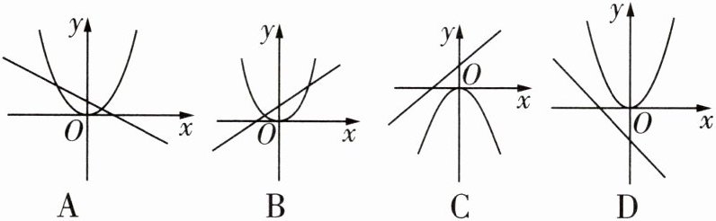 解法二 A项,由一次函数的增减性,知 $ a<0 $,由一次函数的图象与y轴的交点,知 $ a>0 $,故A不符合题意;B项,由二次函数的图象,知 $ a>0 $,由一次函数的图象,知 $ a>0 $,故B符合题意;C项,由二次函数的图象,知 $ a<0 $,由一次函数的图象,知 $ a>0 $,故C不符合题意;D项,由二次函数的图象,知 $ a>0 $,由一次函数的图象,知 $ a<0 $,故D不符合题意.