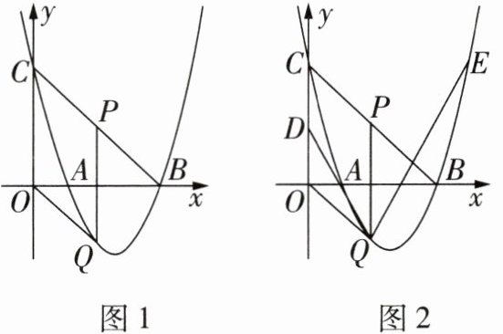 (3)如图2,在(2)的条件下,D是OC的中点,过点Q的直线与抛物线交于点E,且$∠DQE= 2∠ODQ$.在y轴上是否存在点F,使得$\triangle BEF$为等腰三角形?若存在,求点F的坐标;若不存在,请说明理由.
