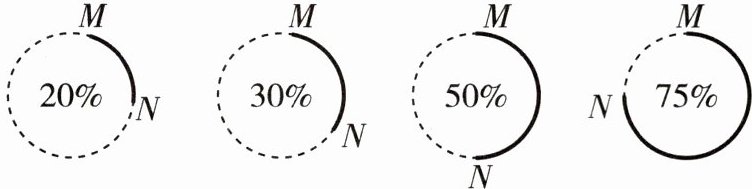 12 新考法[2025北京育才学校期中]计算机处理任务时,经常会以圆形进度条的形式显示任务完成的百分比.如图是同一个任务进行到不同阶段时进度条的示意图,当任务完成的百分比为x时,线段MN的长度记为$d(x)$.下列描述正确的是 ( )