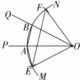 15 如图,已知锐角$\angle POQ$,在射线OP上取一点A,以点O为圆心,OA长为半径作$\overset{\frown}{MN}$,交射线OQ于点B,连接AB,分别以点A,B为圆心,AB长为半径作弧,交$\overset{\frown}{MN}$于点E,F,连接OE,EF,EA,OF.