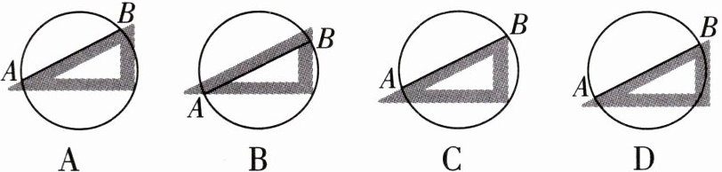 6 新情境 [2024天津河东区期末]有一个未知圆心的圆形工件需要画出圆心,暂时只有一块足够大的直角三角板(无刻度)可以使用.为此需要先得到两条不同的直径,下列寻找直径AB的方法正确的是 ( )