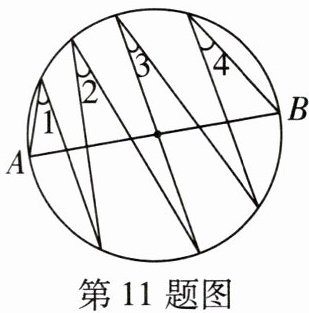 11 一题多解 [2025聊城阳谷期中]如图,AB是圆的直径,$∠1$,$∠2$,$∠3$,$∠4$的顶点均在AB上方的圆弧上,$∠1$,$∠4$的一边分别经过点A,B,则$∠1+∠2+∠3+∠4$的值为 ( )