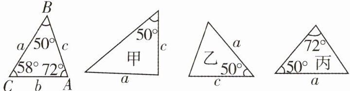 B 在甲中,因为边长为 a,c 的边的夹角未知,所以甲不符合题意;在乙中,两边长分别为 a,c 且夹角为 50°,符合“SAS”,所以乙符合题意;在丙中,两角分别是 50°,72°,且72°角所对的边长是 a,符合“AAS”,所以丙符合题意.故和△ABC 全等的是乙和丙.