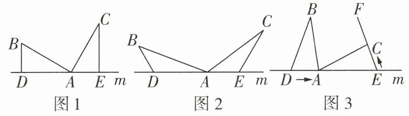 (2)如图3,若$∠BDA= ∠AEC$,$DE= 9cm$,$BD= 7cm$,点A在线段DE上以$2cm/s$的速度由点D向点E运动,同时,点C在线段EF上以$xcm/s$的速度由点E向点F运动,它们运动的时间为$t(s)$。是否存在x,使得$\triangle ABD与\triangle EAC$全等?若存在,求出相应的t值;若不存在,请说明理由。