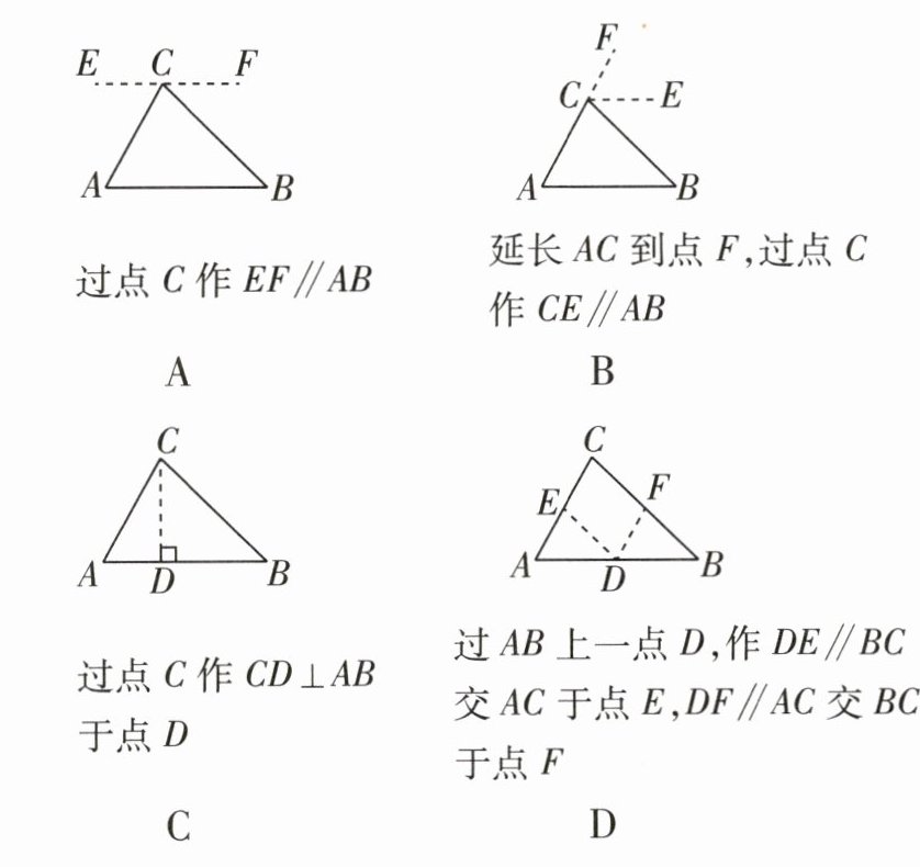 5 [2025德州德城区期中]在探究证明“三角形内角和是$180^{\circ }$"时,某综合实践小组的同学作了如图所示的四种辅助线,其中不能证明“三角形内角和是$180^{\circ }$"的是 ( )