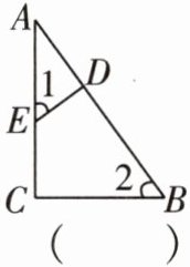 7 [教材 P14T2 变式如图,E 是$\triangle ABC$中 AC 边上的一点,过点 E 作$ED⊥AB$,垂足为点 D. 若$∠1= ∠2$,则$\triangle ABC$是 ( )