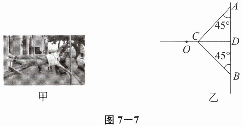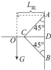 10. “人体旗帜”动作需要运动者完成如图7-7甲所示的动作,用手抓着垂直于地面的杆,使身体与地面保持平行。我们把这个动作简化成如图7-7乙所示的模型,假设人体的重心在O点,人体重力为G,OD长度为$L_1,AB$的长度为$L_2,$两手与杆的夹角均为45°。为了研究方便,我们假定杆子对手施加的力是沿着手臂的方向。