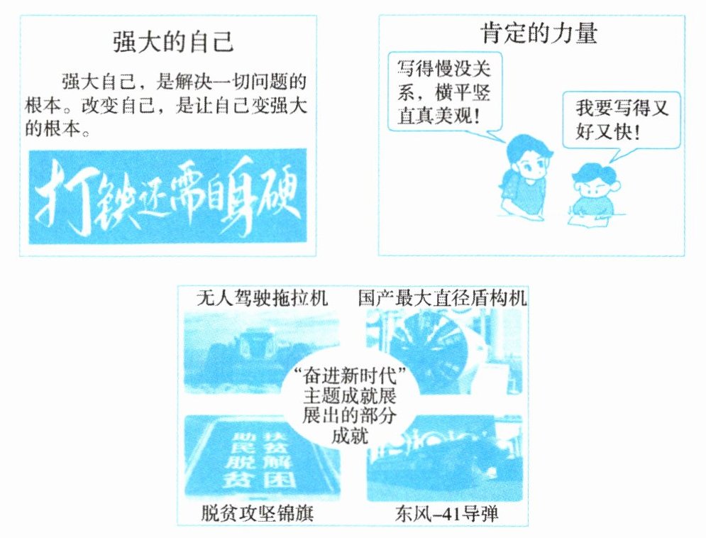 (1)①“打铁还需自身硬”“强大自己,是解决一切问题的根本”告诉我们,新时代青少年的自信源于我们在成长过程中积累的实力。②老师的表扬与肯定让学生获得了自信。这告诉我们,新时代青少年的自信源于和他人交往中获得的肯定。③祖国的快速发展,国家的繁荣富强,赋予我们坚定的民族自信和强大的民族自豪感,让我们拥有了平视世界的底气。这告诉我们,新时代青少年的自信源于从国家繁荣富强中获得的安全感、成就感和自豪感。
