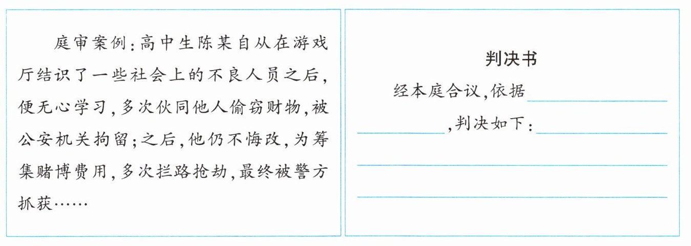 法治意识是学生发展核心素养的重要内容之一。为了增强学生的法治意识,请以班级为单位组织开展一次模拟法庭活动。