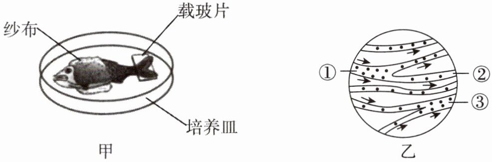 5. 图甲为观察小鱼尾鳍内血液的流动实验部分过程,图乙为血液流动的示意图,①②③表示血管。下列叙述错误的是(