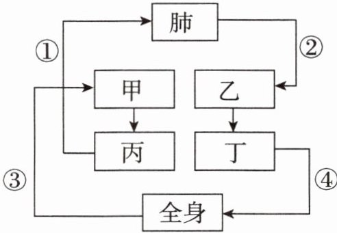 6. 血液循环为人体各个组织细胞不断运来营养物质和氧气,运走二氧化碳等废物。如下是人体血液循环示意图,其中甲~丁代表心脏的四个腔,①~④代表血管。下列叙述正确的是(