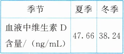 ②在同年夏季和冬季检测志愿者血液中维生素D含量并计算平均值,数据见下表。