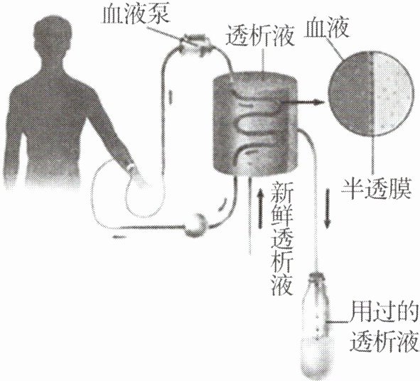 11. 肾脏是人体非常重要的器官,当肾衰竭而无法正常工作时,体内的代谢废物就不能排出,人就会因为中毒而死亡。肾功能衰竭初期患者,可以通过血液透析机进行暂时缓解病症的治疗。如下为血液透析示意图,通过导管与患者的血管相连,位于透析液中的半透膜管道系统的管壁相当于一层半透膜——水、尿素等小分子物质可以透过,蛋白质等大分子物质不能透过。当患者的血液流经半透膜管道系统时,其中的代谢废物就透过半透膜扩散到膜外透析液中去,除去部分代谢废物的血液再流回人体内。据此分析回答下列问题。