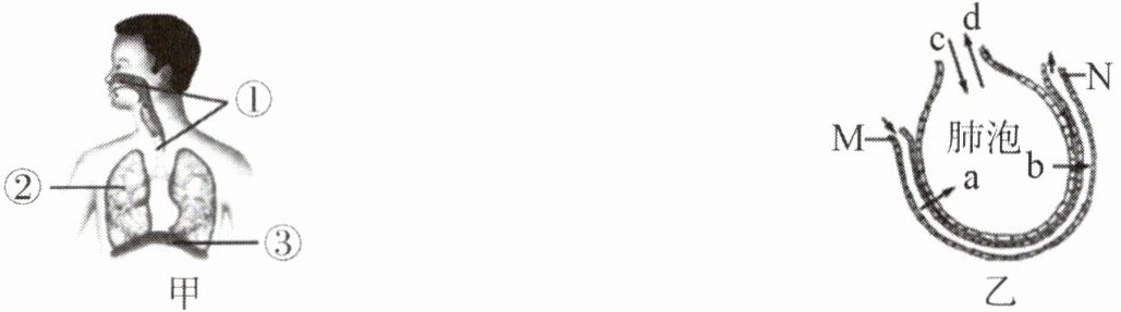 。肺内气体按照图乙中 c 方向运动时,图甲中的③所示结构处于收缩