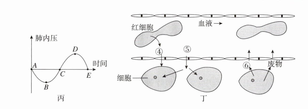 状态时,肺内气压会如图丙中的 AC 段曲线变化。(4)图丁中,由红细胞运送的 [④]