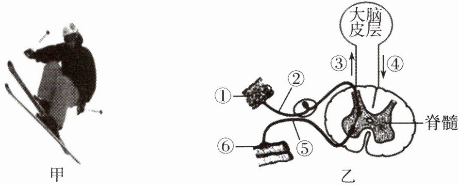 (2)运动员完成跳跃动作时需要注意力高度集中,如不小心摔倒时,腿部受伤会感到疼痛,说明神经冲动传达到图乙中的