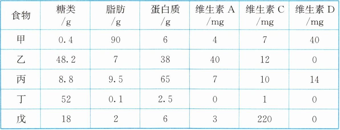 4. 科学合理的营养有助于身体健康。下表列出了甲、乙、丙、丁、戊5种食物(各100g)中除水和无机盐以外的主要成分含量,下列分析错误的是(