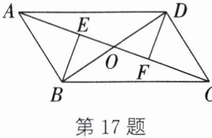 17.(10分)(鞍山中考)如图,在四边形ABCD中,AC与BD相交于点O,$BE⊥AC,DF⊥AC$,垂足分别为E、F,且$BE= DF,∠ABD= ∠BDC$. 求证:四边形ABCD是平行四边形.