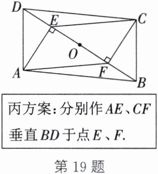 19.(13分)如图,在$□ ABCD$中,$AB>AD,∠ABC$为锐角,O是对角线BD的中点. 某数学学习小组要在BD上找两点E、F,使四边形AECF为平行四边形,现总结出甲、乙、丙三种方案如下: