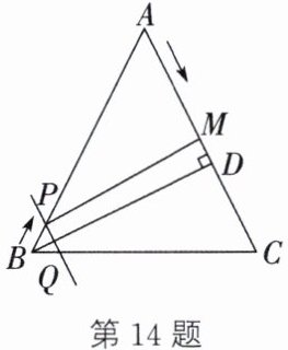14. 分类讨论思想 如图,在$△ABC$中,$AB= AC= 10cm$,$BD⊥AC于点D$,且$BD= 8cm$.点$M从点A$出发,沿$AC$方向匀速运动,速度为$4cm/s$;同时点$P从点B$出发,沿$BA$方向匀速运动,速度为$1cm/s$.过点$P的直线PQ// AC$,交$BC于点Q$,连结$PM$.设运动时间为$ts(0<t<2.5)$,则当$t= $______时,以$P$、$Q$、$D$、$M$为顶点的四边形是平行四边形.