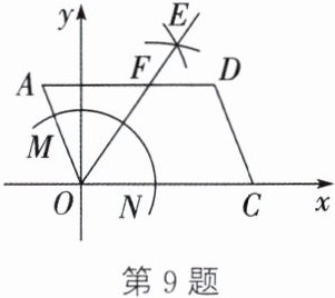 9. 如图,$□ AOCD的顶点O$在原点处,点$C在x$轴的正半轴上,按以下步骤作图:①以点$O$为圆心、适当长为半径画弧,交$OA于点M$,交$OC于点N$;②分别以点$M$、$N$为圆心,大于$\frac {1}{2}MN$的长为半径画弧,两弧在$∠AOC内相交于点E$;③画射线$OE$,交$AD于点F(3,4)$.点$A$的坐标为( )