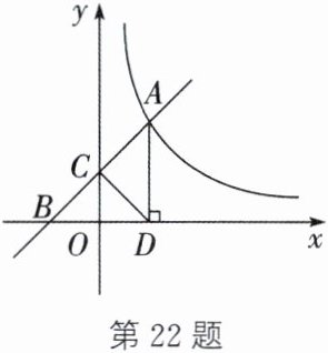 22. (12 分)(徐州中考)如图,一次函数 $ y = k x + b ( k > 0 ) $ 的图象与反比例函数 $ y = \frac { 8 } { x } ( x > 0 ) $ 的图象交于点 $ A $,与 $ x $ 轴交于点 $ B $,与 $ y $ 轴交于点 $ C $,$ A D \perp x $ 轴于点 $ D $,$ C B = C D $,点 $ C $ 关于直线 $ A D $ 的对称点为 $ E $.