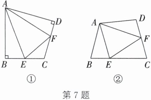 7. (1) 如图①,在四边形ABCD中,AB= AD,∠B= ∠D= 90°,E、F分别是边BC、CD上的点,且$∠EAF= \frac { 1 } { 2 } ∠BAD. $请直接写出线段EF、BE、DF之间的数量关系:____.