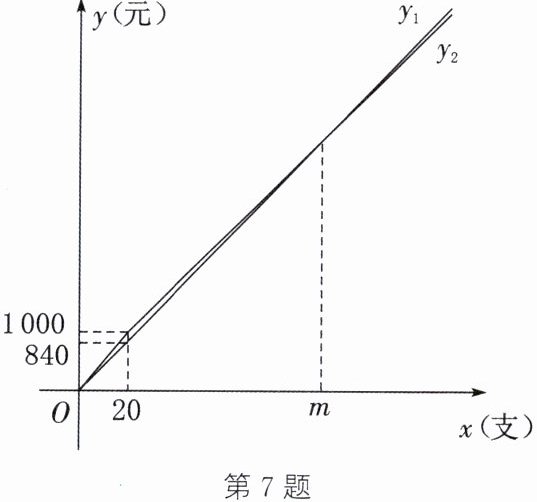 7. 为了丰富学生的课外活动,激发学生参加体育活动的兴趣,某中学准备购买一批新的羽毛球拍. 已知甲、乙两家商店销售同一种羽毛球拍,但两家商店的原价和销售方式均不同. 在甲商店,无论一次性购买多少支羽毛球拍,一律按原价销售;在乙商店,一次性购买羽毛球拍的数量不超过20支,按原价销售,若一次性购买羽毛球拍的数量超过20支,则超出的部分打8折. 设该中学购买了x支羽毛球拍,在甲商店购买所需的费用为$y_{1}$元,在乙商店购买所需的费用为$y_{2}$元.$y_{1}$、$y_{2}$关于x的函数图象如图所示.