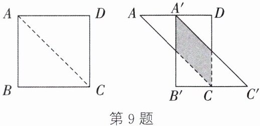 9. 如图,将边长为2cm的正方形ABCD沿其对角线AC剪开,再把$\triangle ABC$沿着AD方向平移,得到$\triangle A'B'C'$.若两个三角形重叠部分的面积是$1cm^{2}$,则它移动的距离$AA'$的长为( )