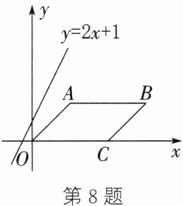 8. 如图,在平面直角坐标系中,$□ OABC$的边OC落在x轴的正半轴上,点$C(4,0)$、$B(6,2)$.直线$y= 2x+1$以每秒3个单位的速度向下平移,经过一段时间,该直线将$□ OABC$的面积平分,则经过的时间为( )