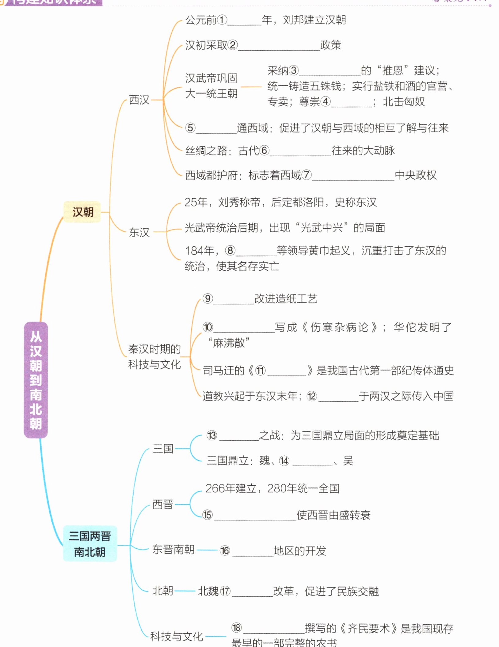 ①202 ②休养生息 ③主父偃 ④儒术 ⑤张骞 ⑥东西方 ⑦正式归属 ⑧张角 ⑨蔡伦 ⑩张仲景 ⑪史记 ⑫佛教 ⑬赤壁 ⑭蜀 ⑮八王之乱 ⑯江南 ⑰孝文帝 ⑱贾思勰
