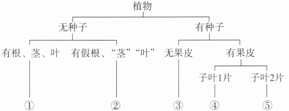 2. 在学习生物分类的方法后,同学们尝试用画概念图的方法对植物进行分类,图中的①~⑤分别代表( )