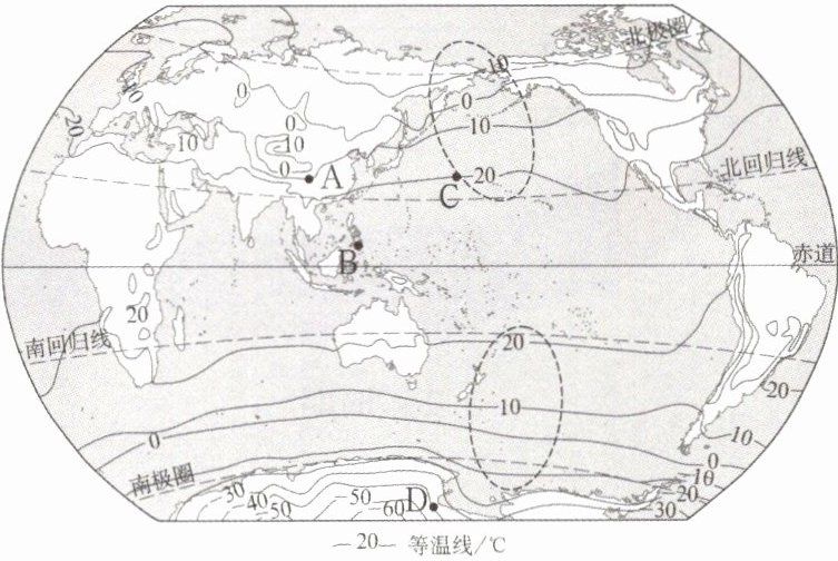 (1)题,读图可知,A地所在的等温线是10℃等温线,所以A地气温是10℃。A地为10℃,B地大于20℃,C地为20℃,D地为-40℃,所以ABCD四地气温由高到低是BCAD。第