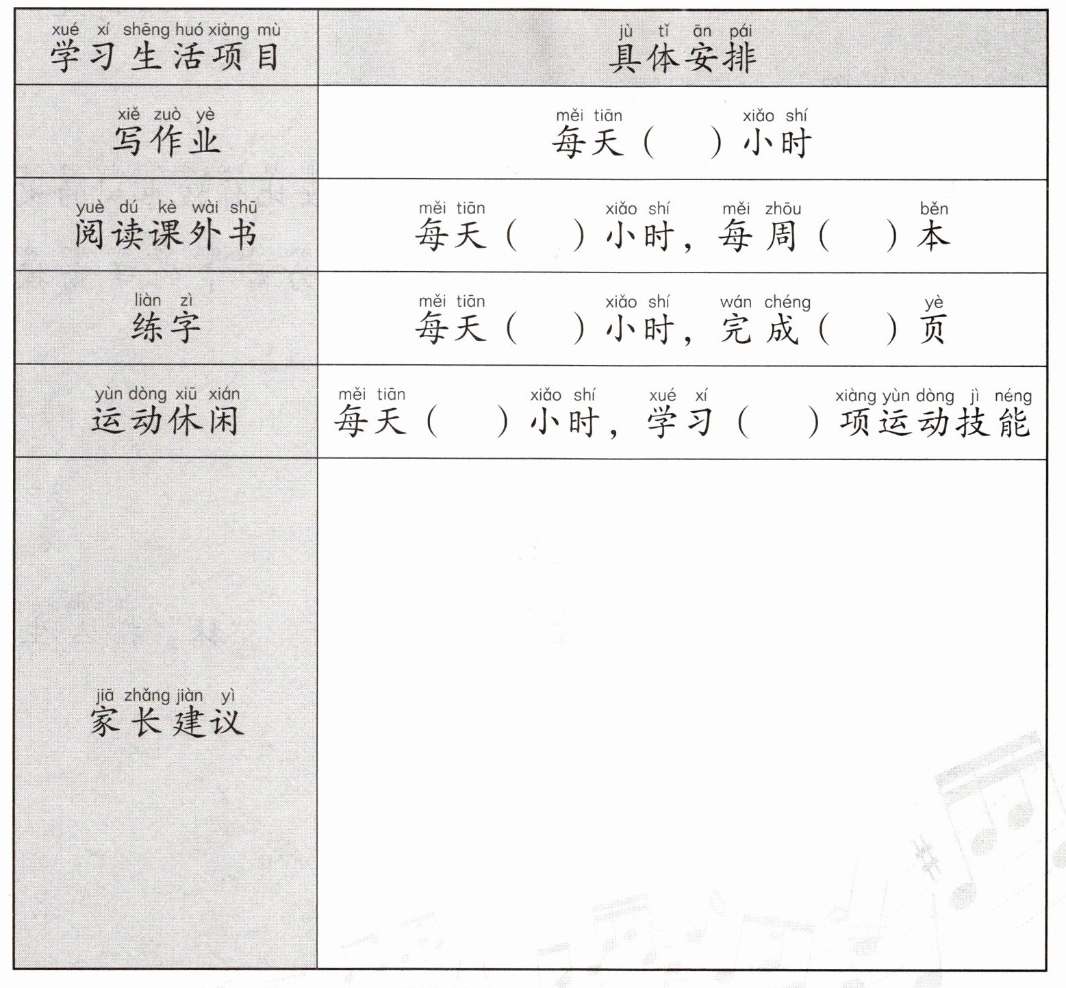 (答案不唯一,可根据自身实际情况填写)分别对应计划表里不同项目的时间或数量空)