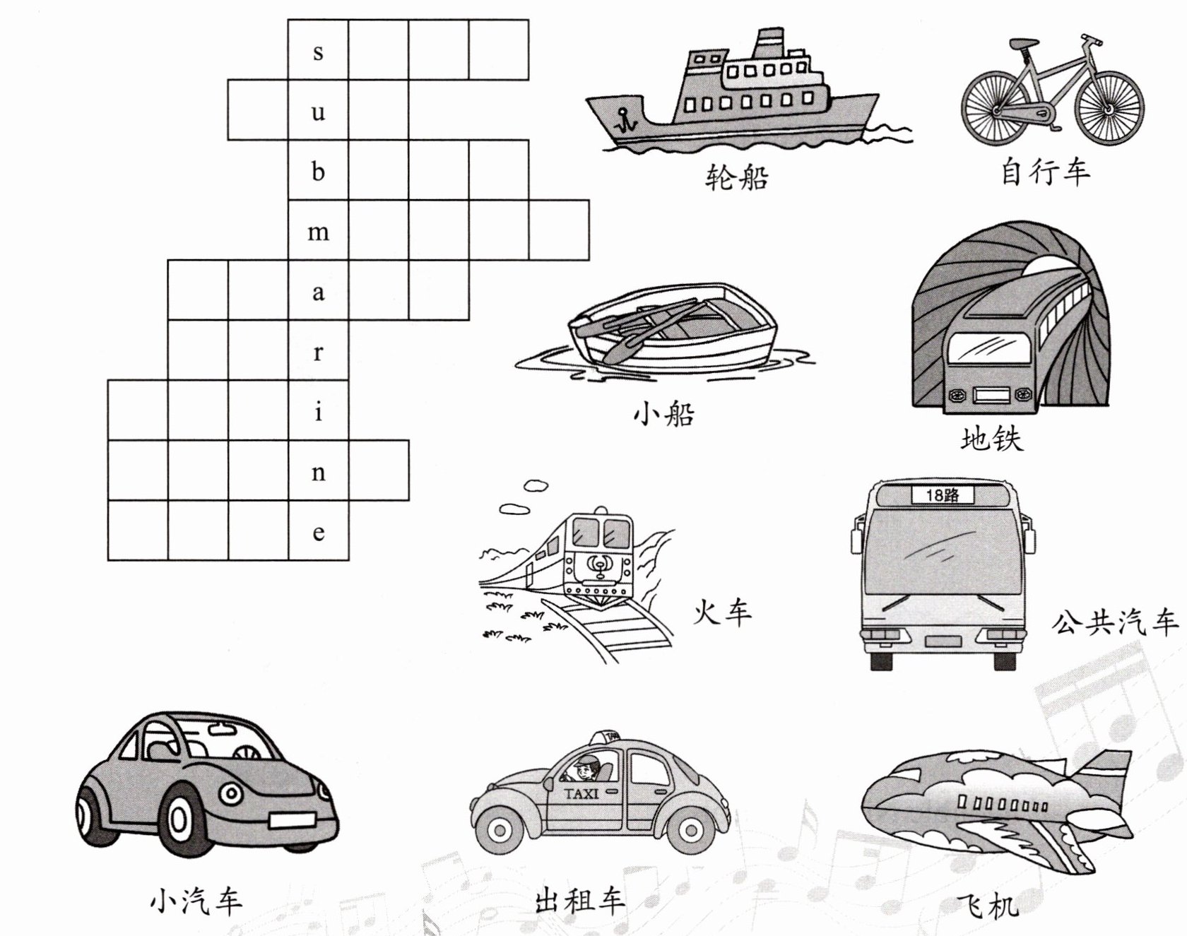 字谜从上到下依次为:ship bus boat metro train car taxi plane bike