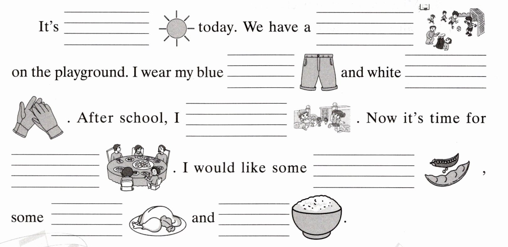sunny PE class shorts gloves go home dinner green beans chicken rice