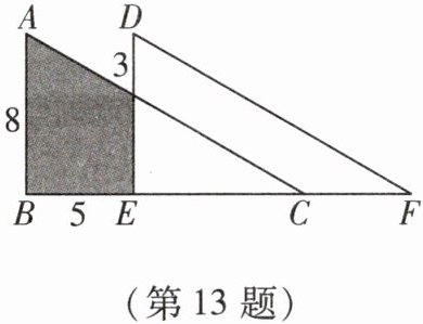 13. 如图,原来是重叠的两个直角三角形,将其中一个三角形沿 $ BC $ 方向平移 $ BE $ 的距离,就得到此图形,求阴影部分的面积(单位:cm).