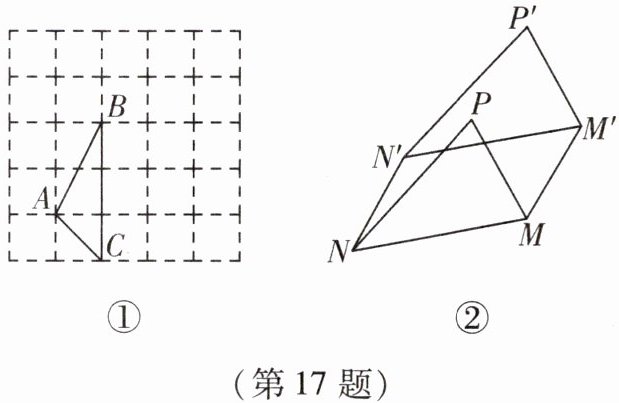 17. 图①是由 25 个边长为 1 个单位长度的小正方形组成的 $ 5 × 5 $ 网格,三角形 $ ABC $ 的端点都在小正方形的顶点,请按要求画图并解决问题: