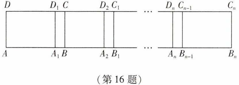 16. 如图,长方形 $ ABCD $ 中,$ AB = 6 $,第 1 次将长方形 $ ABCD $ 沿 $ AB $ 的方向平移,距离为 5,得到长方形 $ A_1B_1C_1D_1 $,第 2 次将长方形 $ A_1B_1C_1D_1 $ 沿 $ A_1B_1 $ 的方向平移,距离为 5,得到长方形 $ A_2B_2C_2D_2 … $,第 $ n $ 次将长方形 $ A_{n - 1}B_{n - 1}C_{n - 1}D_{n - 1} $ 沿 $ A_{n - 1}B_{n - 1} $ 的方向平移,距离为 5,得到长方形 $ A_nB_nC_nD_n(n > 2) $.