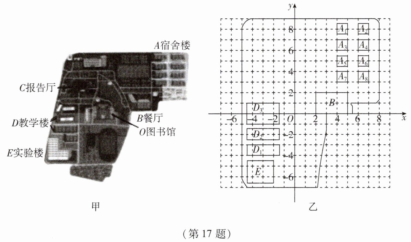 第一步:图乙为该学校平面示意图简图,建立以图书馆为原点的平面直角坐标系,记建筑物中心点的坐标为该建筑坐标,该坐标系中1个单位长度表示的距离为50m.