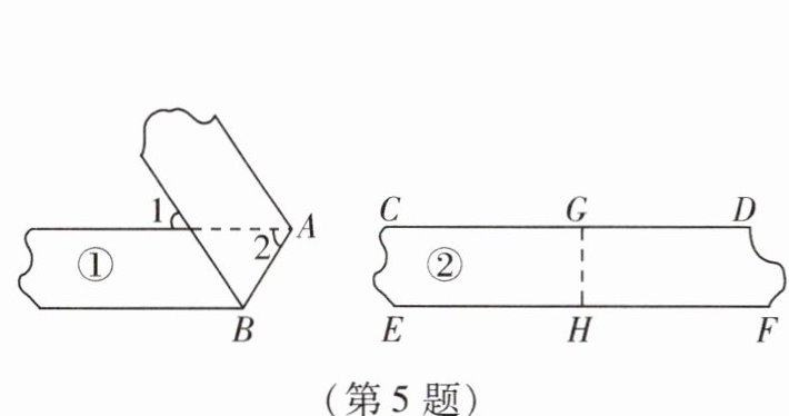 5. 一次数学活动中,检验两条纸带①②的边线是否平行,小明和小丽采用两种不同的方法:小明将纸带①沿$AB$折叠,量得$∠1= ∠2= 50^{\circ }$;小丽将纸带②沿$GH$折叠,发现$GD与GC$重合,$HF与HE$重合,则下列判断正确的是(