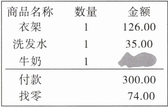 李阿姨在记录一周的家庭开支时,发现一张购物小票被弄脏了。你能帮李阿姨算一算被弄脏处的金额是多少吗?
