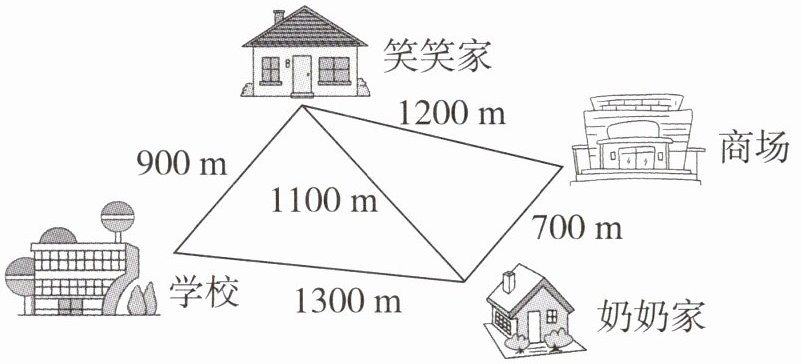走直接去奶奶家那条路最近,走经过学校去奶奶家那条路最远,最近的路与最远的路相差1100米。