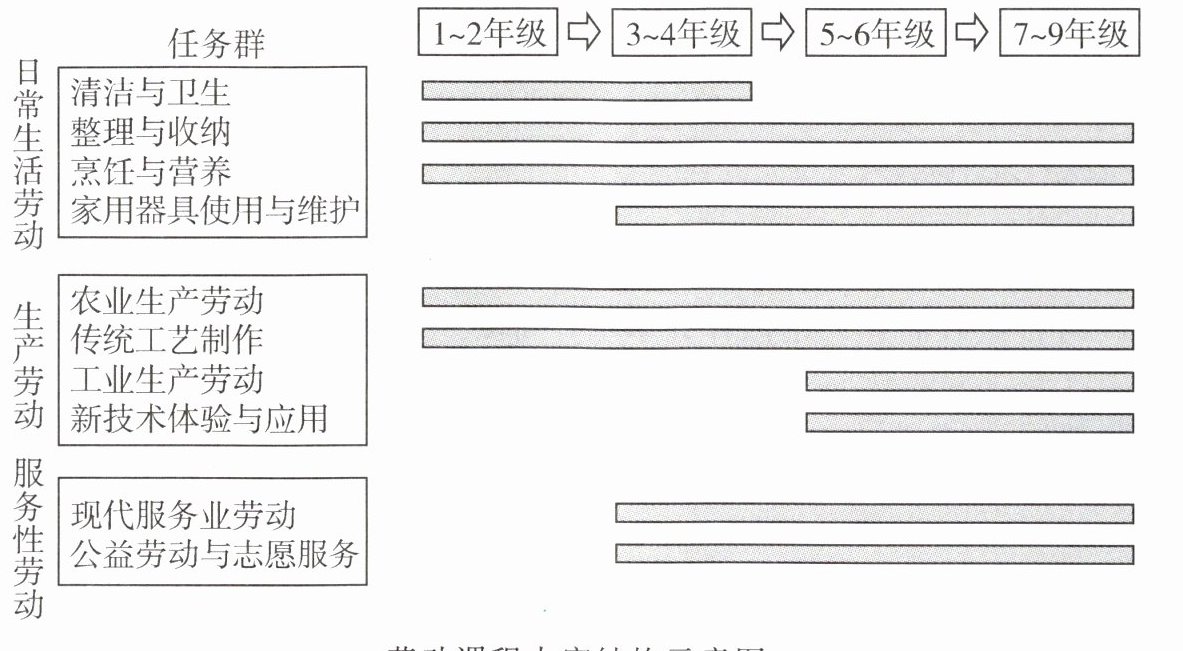 2. 示例:(1)劳动课程对不同年龄阶段有不同的任务要求,随着年级升高,劳动课程内容难度加大。