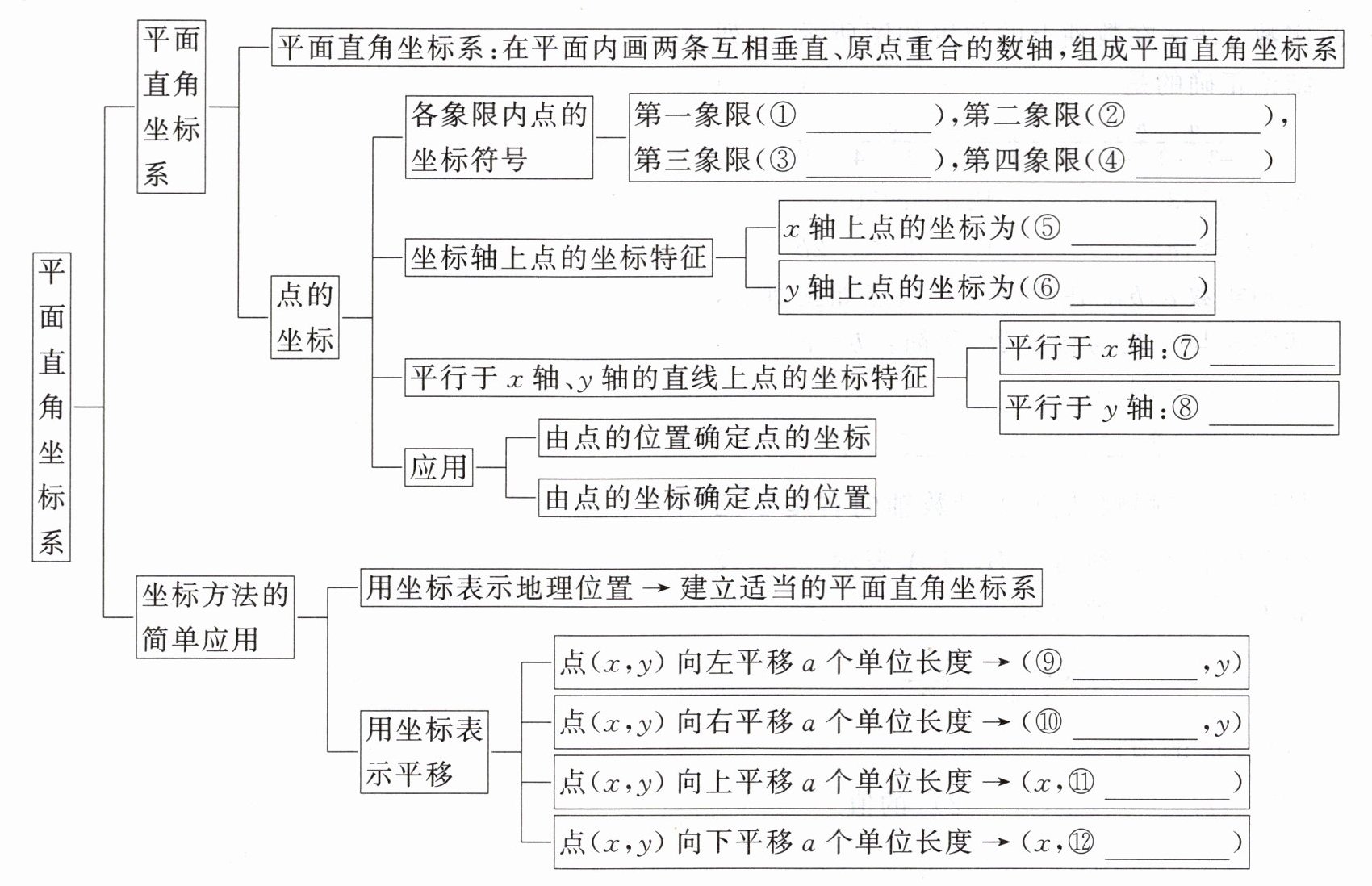 ①+,+ ②-,+ ③-,- ④+,- ⑤x,0 ⑥0,y ⑦纵坐标相等 ⑧横坐标相等 ⑨x - a ⑩x + a ⑪y + a ⑫y - a