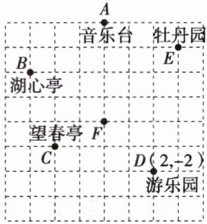(2)根据游乐园D的坐标为(2,-2),可知图中的每个方格的长度为1,结合直角坐标系可知:音乐台A的坐标为(0,4),湖心亭B的坐标为(-3,2),望春亭C的坐标为(-2,-1),牡丹园E的坐标为(3,3)。