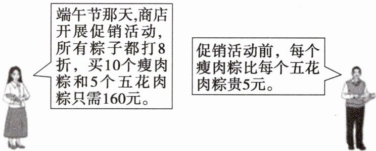 例 4 端午节是中国传统节日,人们有吃粽子的习俗。某商店售卖某品牌瘦肉粽和五花肉粽。请依据以下对话,求促销活动前每个瘦肉粽、五花肉粽的售价。