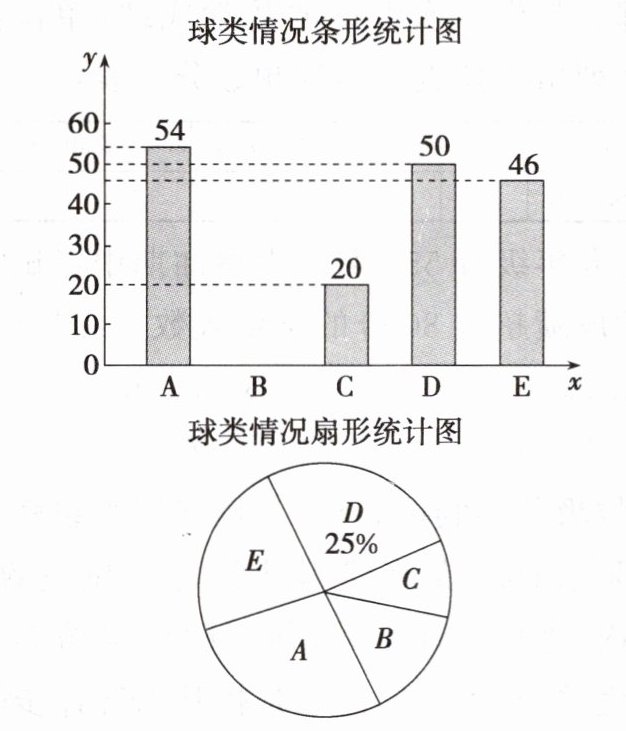 2. 某校为丰富学生的课余生活,开展了多姿多彩的体育活动,开设了五种球类运动项目:A篮球,B足球,C排球,D羽毛球,E乒乓球. 为了解学生最喜欢以上哪种球类运动项目,随机抽取部分学生进行调查(每位学生仅选一种),并绘制了统计图. 某同学不小心将图中部分数据丢失,请结合统计图,完成下列问题: