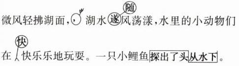 微风轻拂湖面,,湖水遂风荡漾,水里的小动物们在快乐乐地玩耍。一只小鲤鱼探出了头从水下。