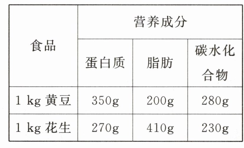 1. 据营养学专家介绍,1 kg 黄豆和 1 kg 花生所含营养成分如下表。